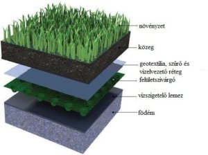 A szigetelés alapja a jó minőségű gumilemez, ami akár 50 évre biztosítja a tökéletes vízzárást. Erre jön a felületszivárgó réteg, majd a vízelvezető- és szűrő rétegként működő geotextilia. Erre már a termőföld kerül, és jöhet a pázsit, vagy a virághagymák, elképzelés szerint.